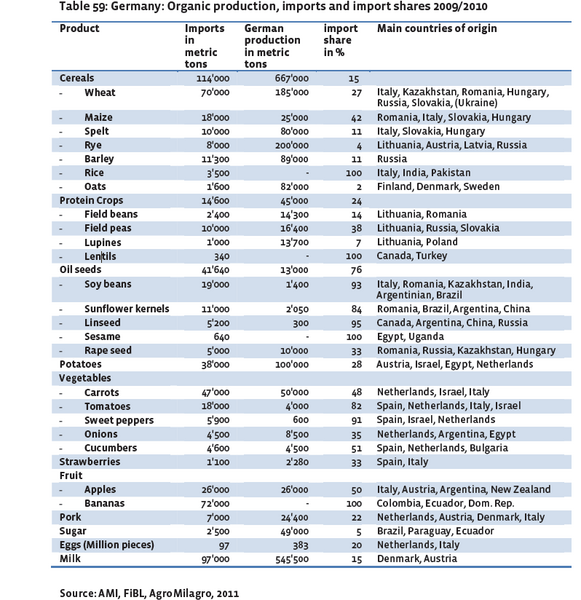 In many of the above-mentioned countries, areas are under conversion, and thus further products can be expected for the international market from there. Already now, Germany is relying on these imports, in particular for products that can be produced here only with difficulties or that can only be seasonally produced. For many livestock products such as eggs, milk, and pork, German consumption is currently higher than production. If enough and cheaper feedstuffs were available, there would be significant potential for these products. When looking at the data for the first three quarters of 2011 and consumer trends in 2011, the organic market is likely to continue to grow at high rates.