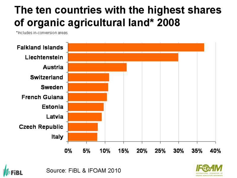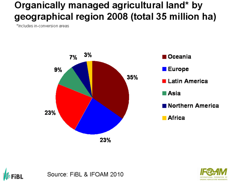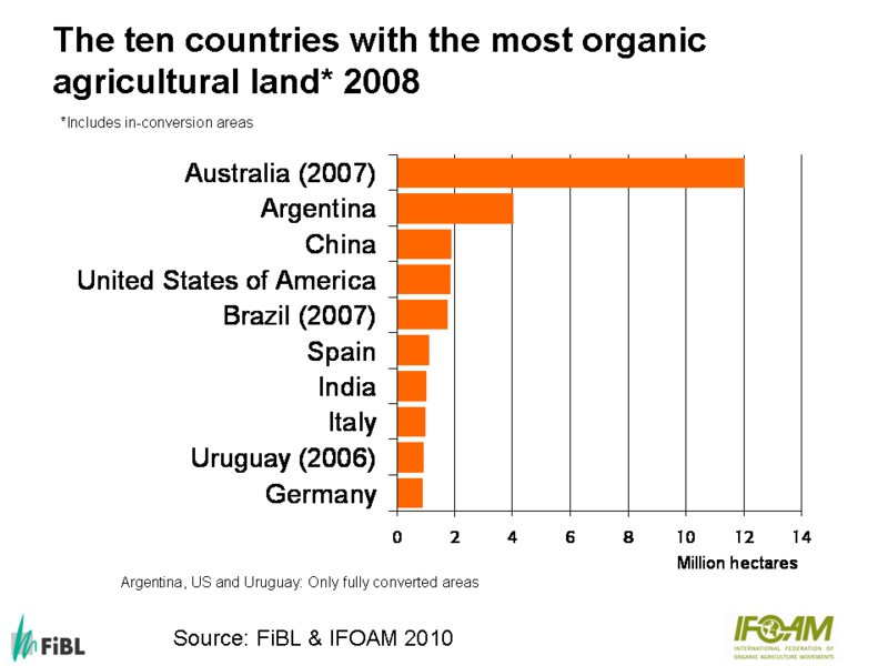 At this page some graphs from the 2010 edition of 'The World of Organic Agriculture' are displayed (data 2008). For further graphs see Power Point Presentation on the key results of the global survey of organic agriculture 2010.