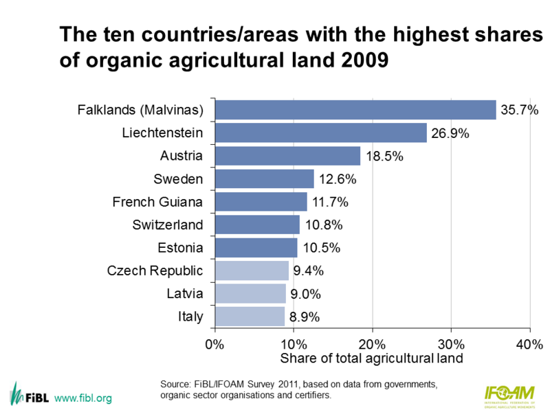 The ten countries/areas with the highest shares of organic agricultural land 2009