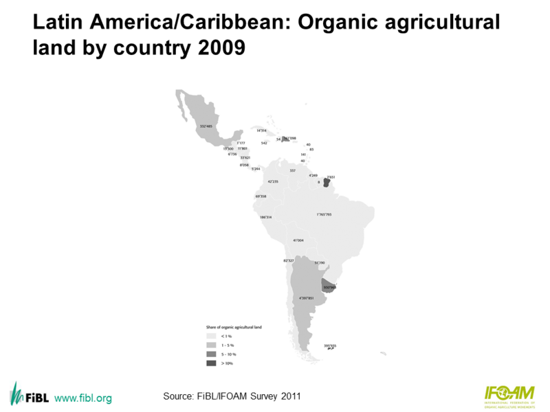 Map: Latin America/Caribbean: Organic agricultural land by country 2009