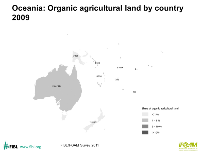 Map: Oceania: Organic agricultural land by country 2009