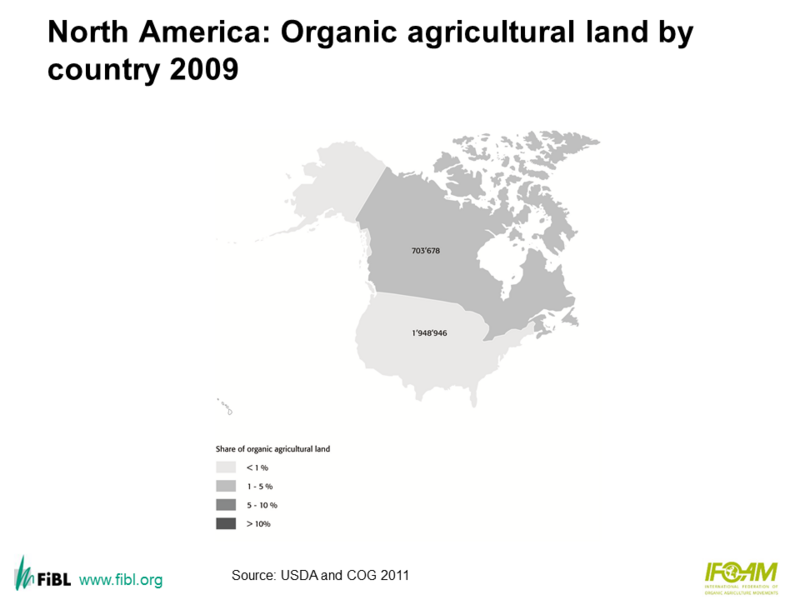 Map: North America: Organic agricultural land by country 2009
